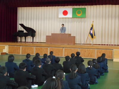 体育館に集合し、新しい先生を迎えての新任式。4名の先生方から新任のあいさつがありました。