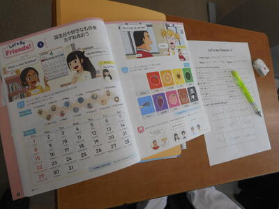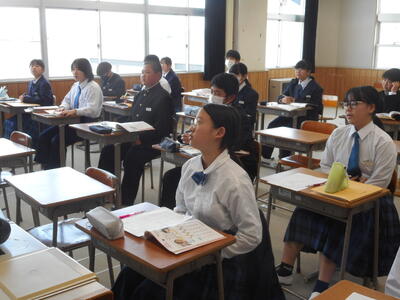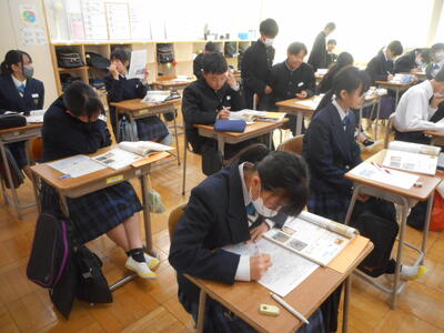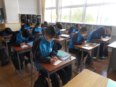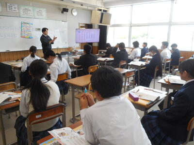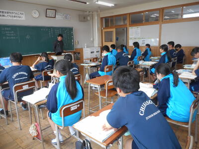 1年生は英語の授業。小学校から発展して本格的な学習に。All Englishで頑張りましょう。