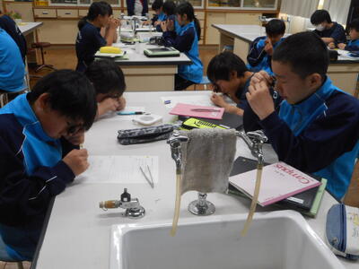 理科では、菜の花のつくりをルーペで観察。