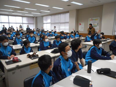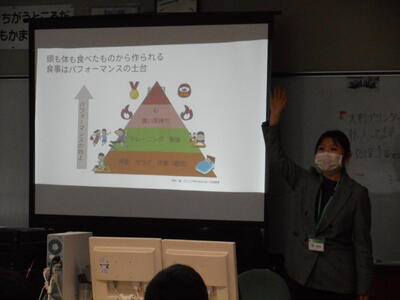 授業に参加したのは2年生。若草中学校の霜田学校栄養士が講師となり、「スポーツをするための効果的な食事について考えよう」というテーマでお話いただきました。