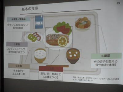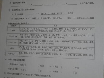 スポーツ選手が食べている三食の献立から気付いたことを書き出し、毎日の食事の基本について考えました。各栄養素の果たす役割についても理解を深めました。