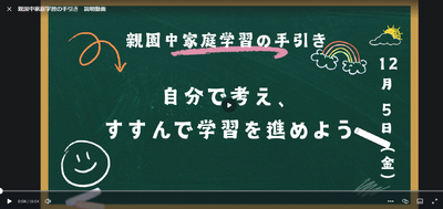 本校の学校経営目標のひとつである「自立した学習者」の育成に向けて「家庭学習の手引き」を作成し、解説動画にまとめました。学習指導の趣旨をご理解いただき、お子さんの家庭学習に役立てていただきたいと思います。画像の下のリンクからご視聴ください。