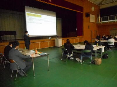 授業のあとは、体育館で研修会。先生方はこのような研修を通して、日々よりよい授業づくりを目指しています。