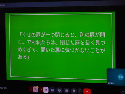 校長講話は、ヘレン・ケラーについて。ヘレン・ケラーは、三重苦(視覚、聴覚、発話の障がい)を乗り越え、世界中の人々に希望と勇気を与えたアメリカの女性です。彼女の人生は、困難に立ち向かう人間の精神の強さを示しています。今日の話から「目の前の当たり前は、多くの人の支えによて成り立っている、自立を目指し、困難を自分の力で乗り越えよう」ということを学びました。
