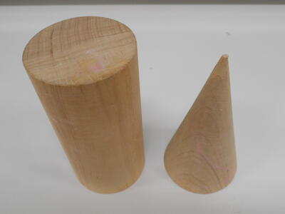 では、先のとがった「錐体」の体積となると、どう求めるのでしょう?これが今日のメインテーマ。同じ底面と高さの立体模型で考え、その結果を予想してみます。