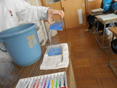 皆さんご存じの通り、この実験は3杯でいっぱいになります。つまり、もとの円錐(角錐)の体積の1/3になるのですが、ぴったりそうなるか結果にわくわく。水が床にこぼれるハプニングもありましたが、両クラスとも3杯分であることを確認することができました。これにより導かれた考え方は「錐体の体積=底面積×高さ×1/3」。