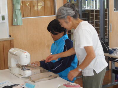 今日の1年生の家庭科の授業はミシンの実習。地域学校協働本部事業として、4名のミシンボランティアの皆様に来校いただき、アドバイスをいただきました。