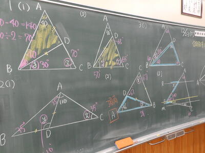 2年生は平行線と角の学習から三角形の学習へ。今日は角度を求める演習。様々な図形の性質(定理)を使って角度を求めていきます。考えを出し合いながら協働して答えを導きます。考えをアウトプットすることが、学んだ知識を定着させるコツです。